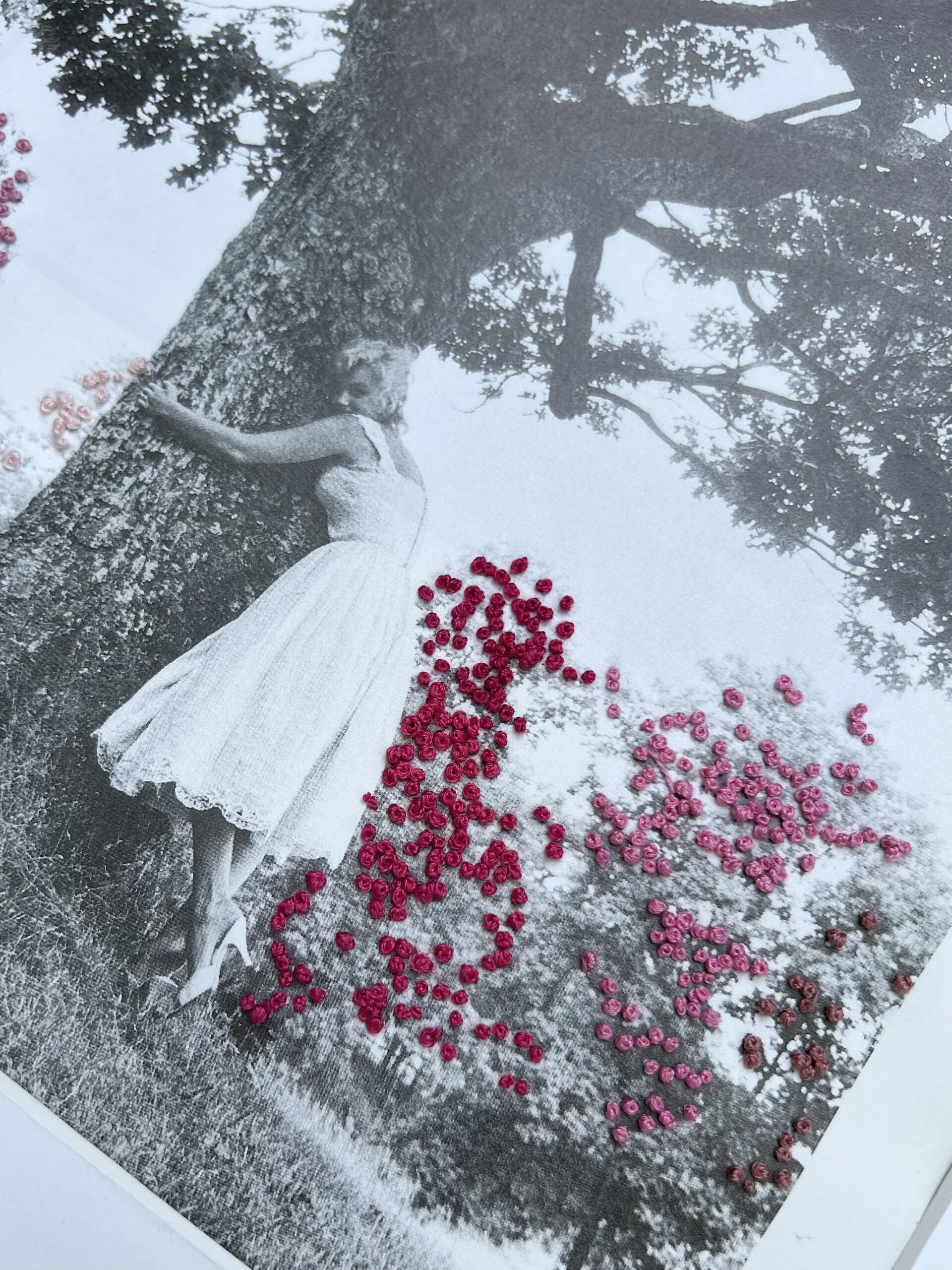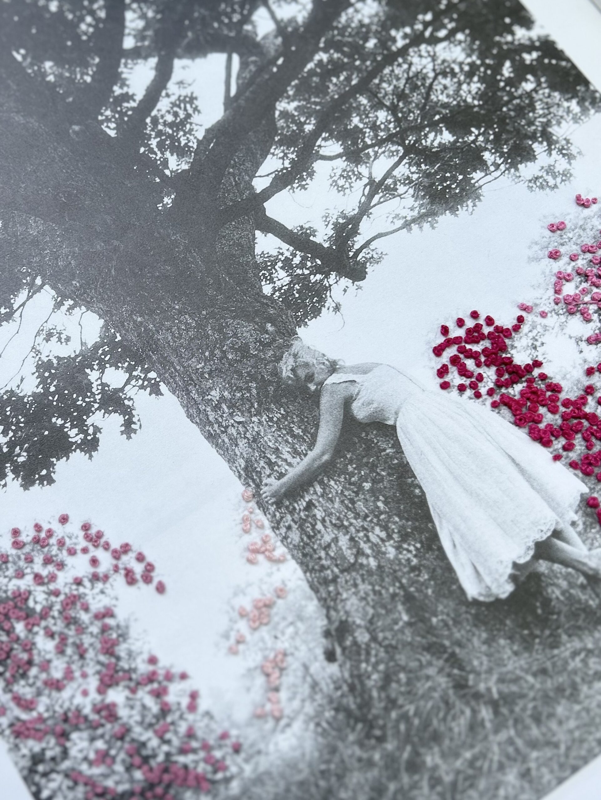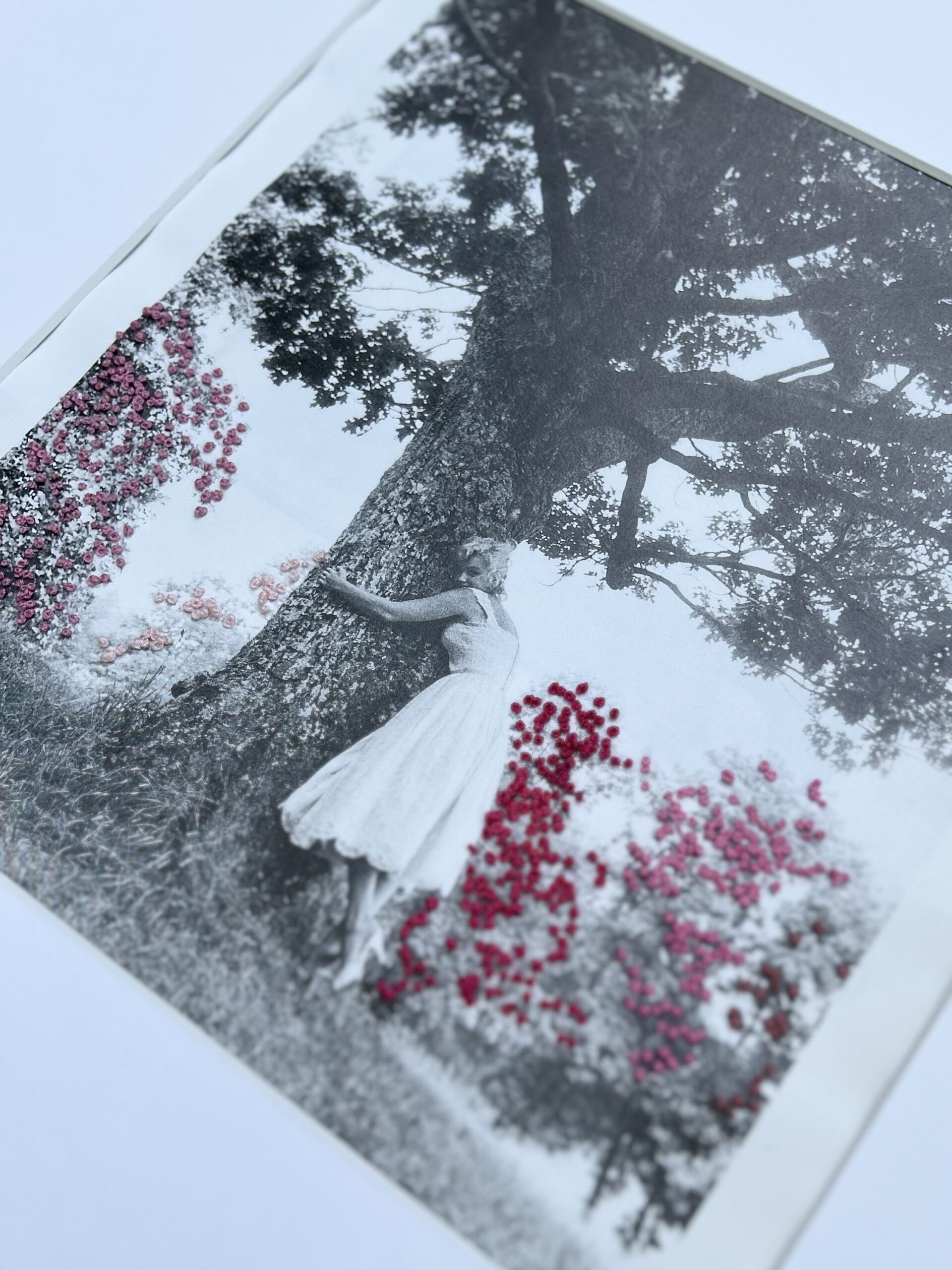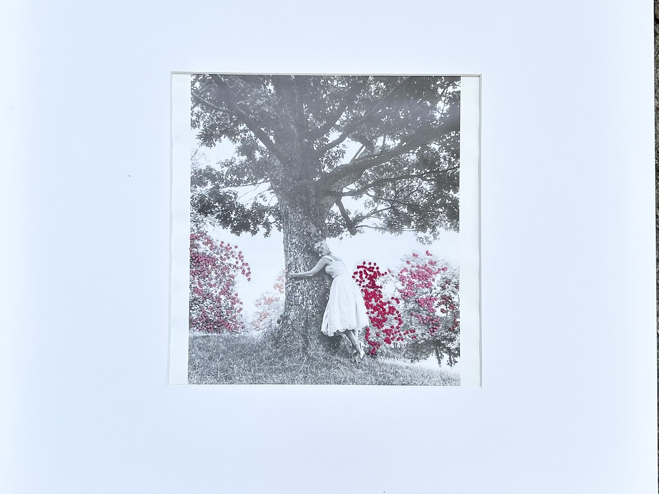 Hand-embroidered mixed-media artwork stitched directly onto a photographic image from a photo book, featuring Marilyn Monroe embracing a tree with embroidered blossoms. One of a kind.