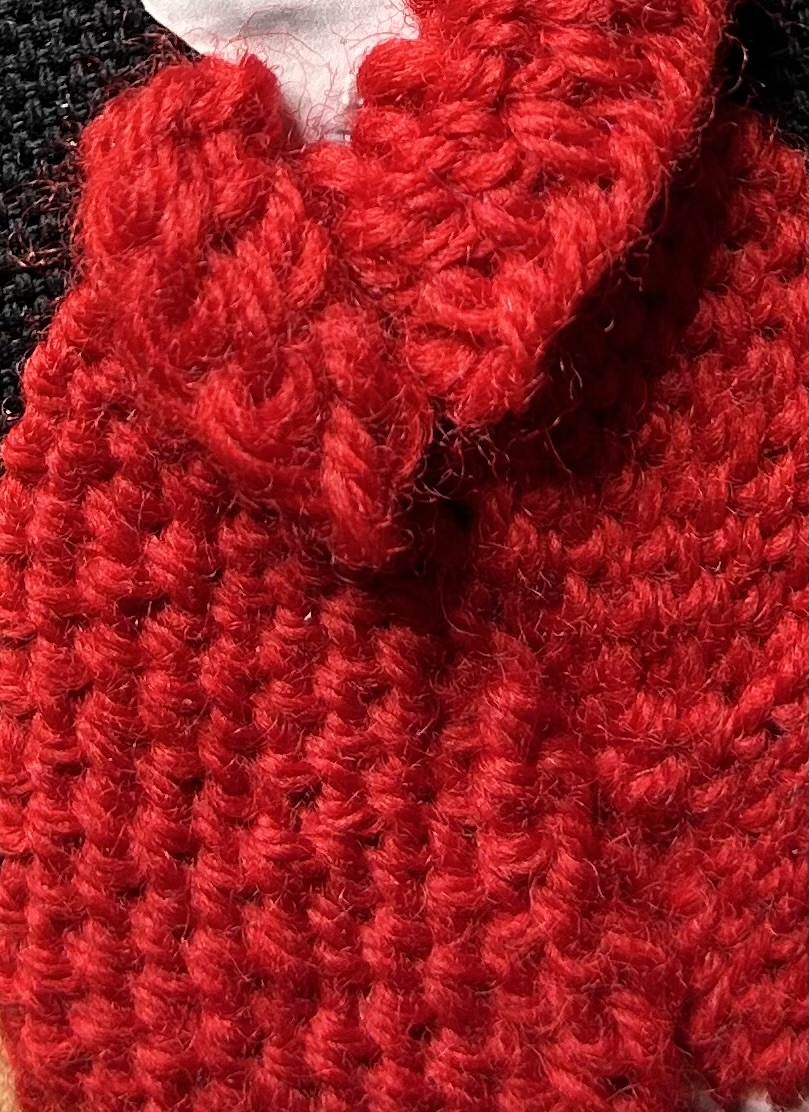 The richly textured red fiber is hand-stitched, creating a dimensional surface that transforms softness into something more deliberate—almost architectural. A small embroidered floral detail crowns her head, introducing a quiet tension between ornament and control.