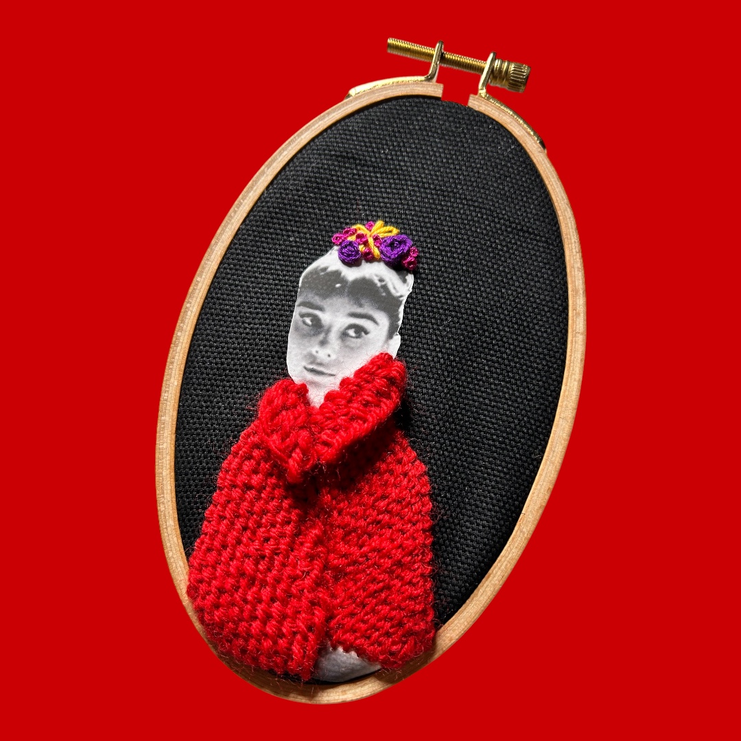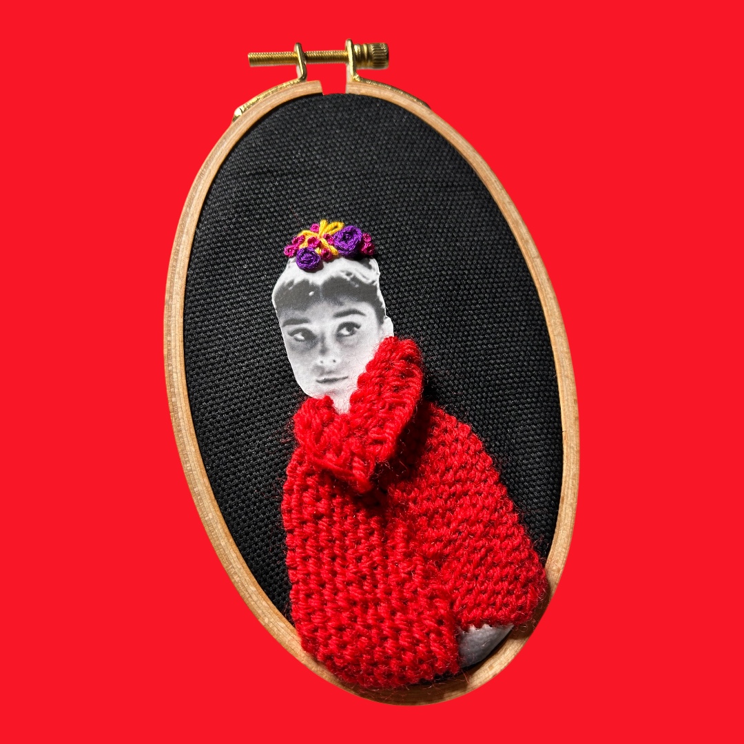 This one-of-a-kind textile portrait of Audrey Hepburn reimagines her iconic delicacy through bold material contrast. Set against a deep black ground, her figure emerges in stark clarity, wrapped in a sculptural red knit garment that feels both protective and confrontational.