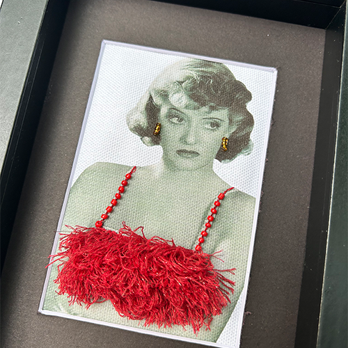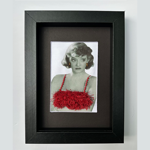 Divine Tension is a one-of-a-kind piece of hand-embroidered textile art, featuring a vintage portrait of Bette Davis heat-transferred onto cotton and elevated with dramatic, hand-stitched detailing. Her glamorous red top is made from textured yarn and beaded embroidery, contrasted by a subtle color wash and gold thread earrings.