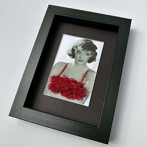 Framed in a minimalist shadow box, this piece captures the elegance and edge of vintage Hollywood while transforming the image through the language of fiber and fashion. This work is part of anongoing series exploring memory, performance, and identity through embroidery.