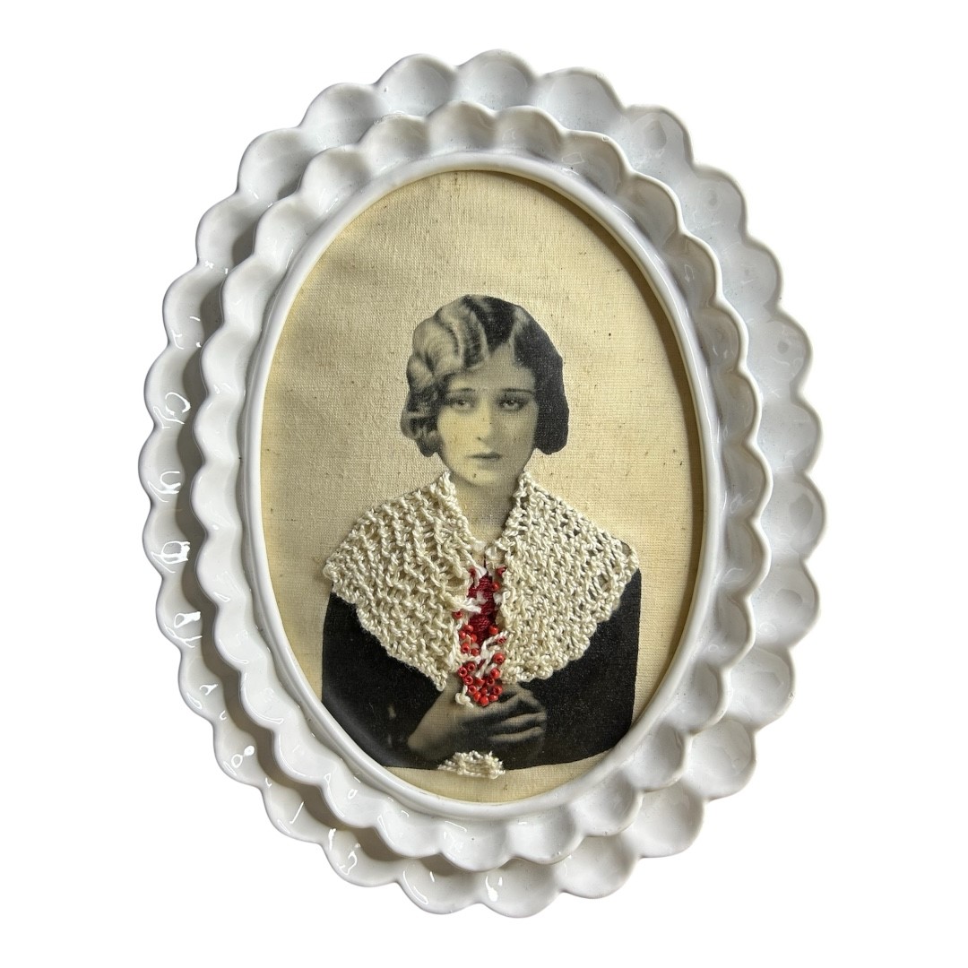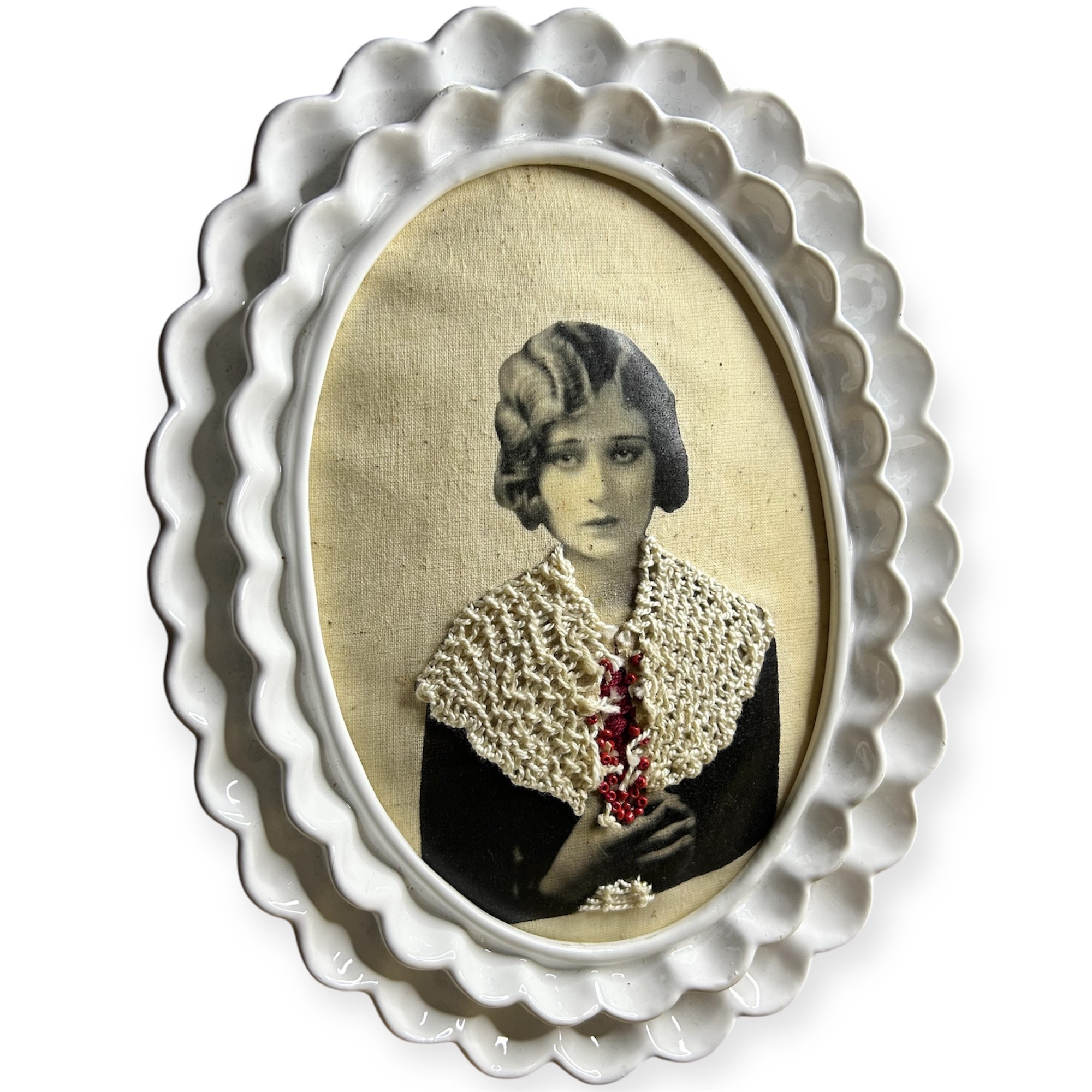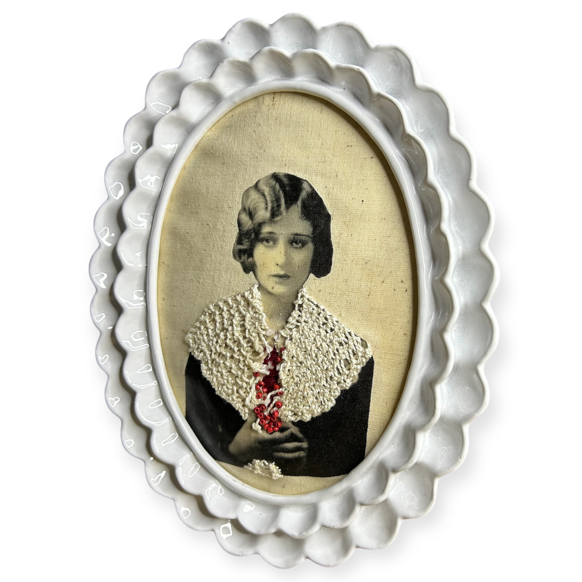 This one-of-a-kind mixed media artwork combines the elegance of a vintage black-and-white photograph with the delicate touch of hand embroidery. The piece features a solemn woman framed in an ornate white scalloped ceramic oval frame, her clothing embellished with textured crochet-style embroidery and red thread accents.