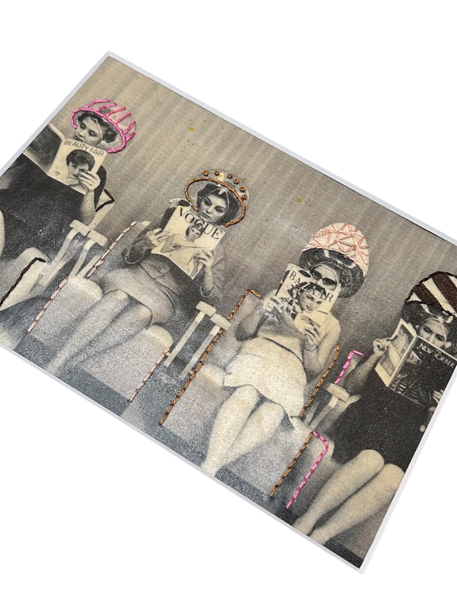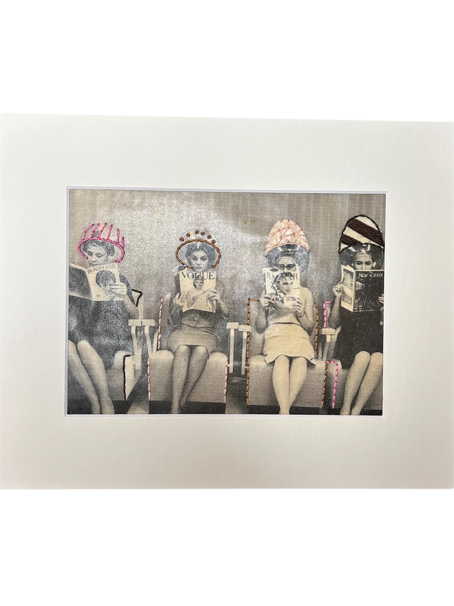This mixed-media fiber artwork reworks a vintage black-and-white photograph of women seated beneath salon dryers, absorbed in fashion magazines and newspapers. Subtle hand embroidery brings individuality and humor to each figure: stitched hair-dryer caps, halos, patterned details, and delicate accents that distinguish one woman from the next while maintaining a shared rhythm across the composition.
