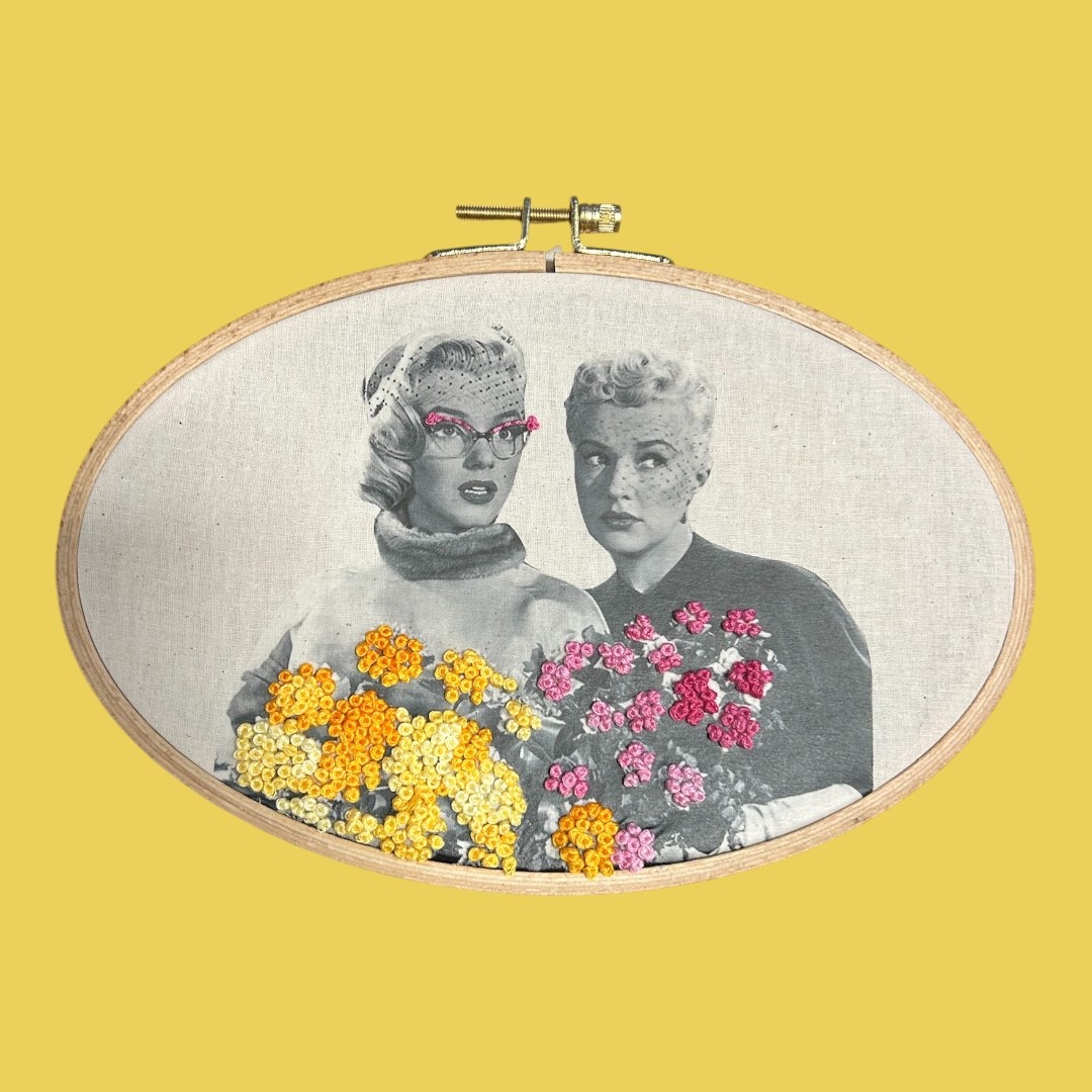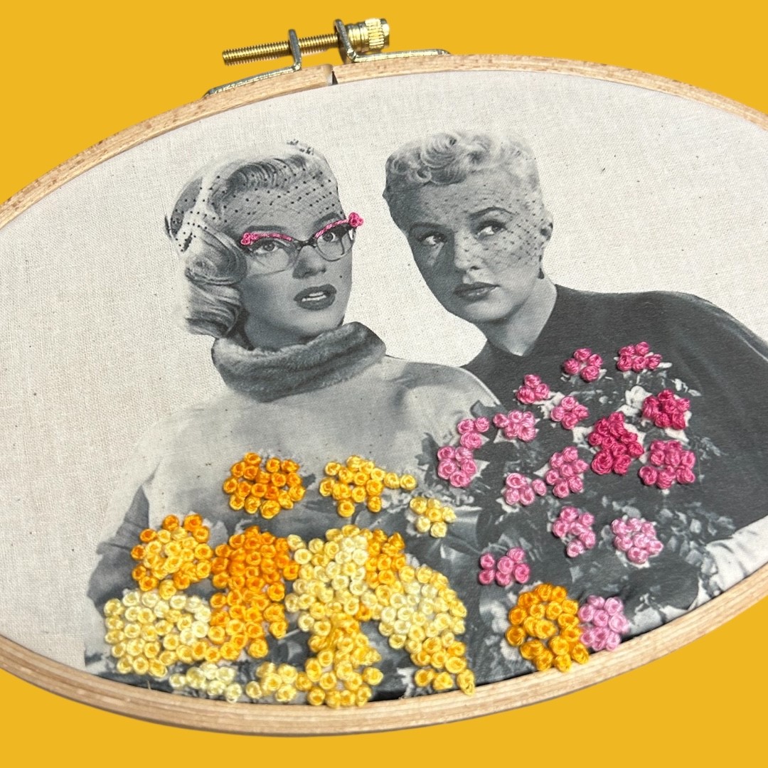 This hand-embroidered mixed media textile artwork is inspired by the iconic glamour of the classic film How to Marry a Millionaire, celebrating the elegance, wit, and style of 1950s Hollywood cinema. Printed vintage imagery is transformed through detailed hand embroidery, with vibrant floral stitching that brings warmth, texture, and color to the black-and-white composition.
