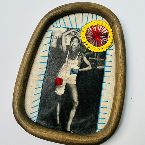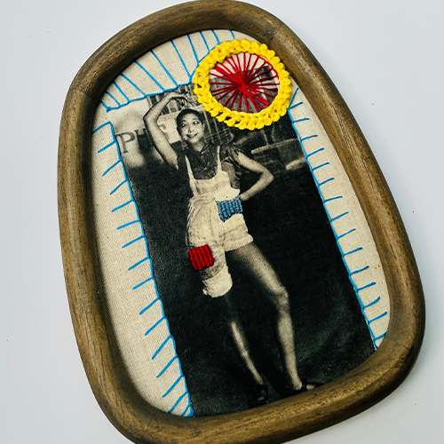 Stage Light is an original hand-embroidered portrait of legendary performer and activist Josephine Baker, captured in an archival black-and-white image and reimagined through the language of thread and texture.The image is heat-transferred onto cotton and adorned with vibrant hand embroidery—including a radiating yellow and red sunburst stitched above her, playful patchwork details in red and blue, and a bright blue border that frames her like a spotlight.