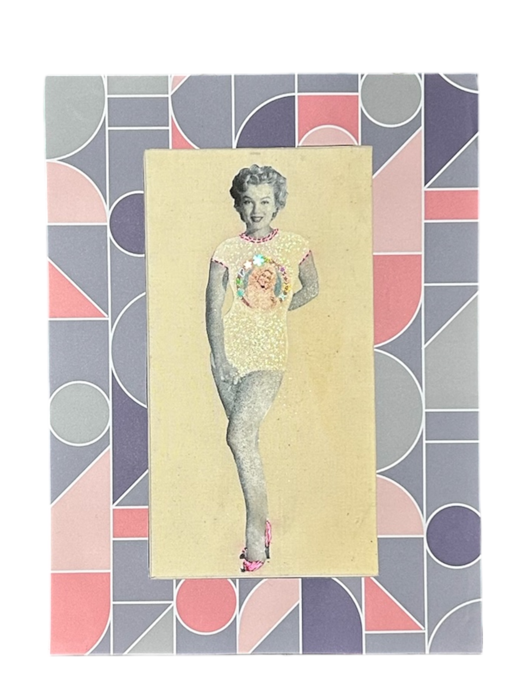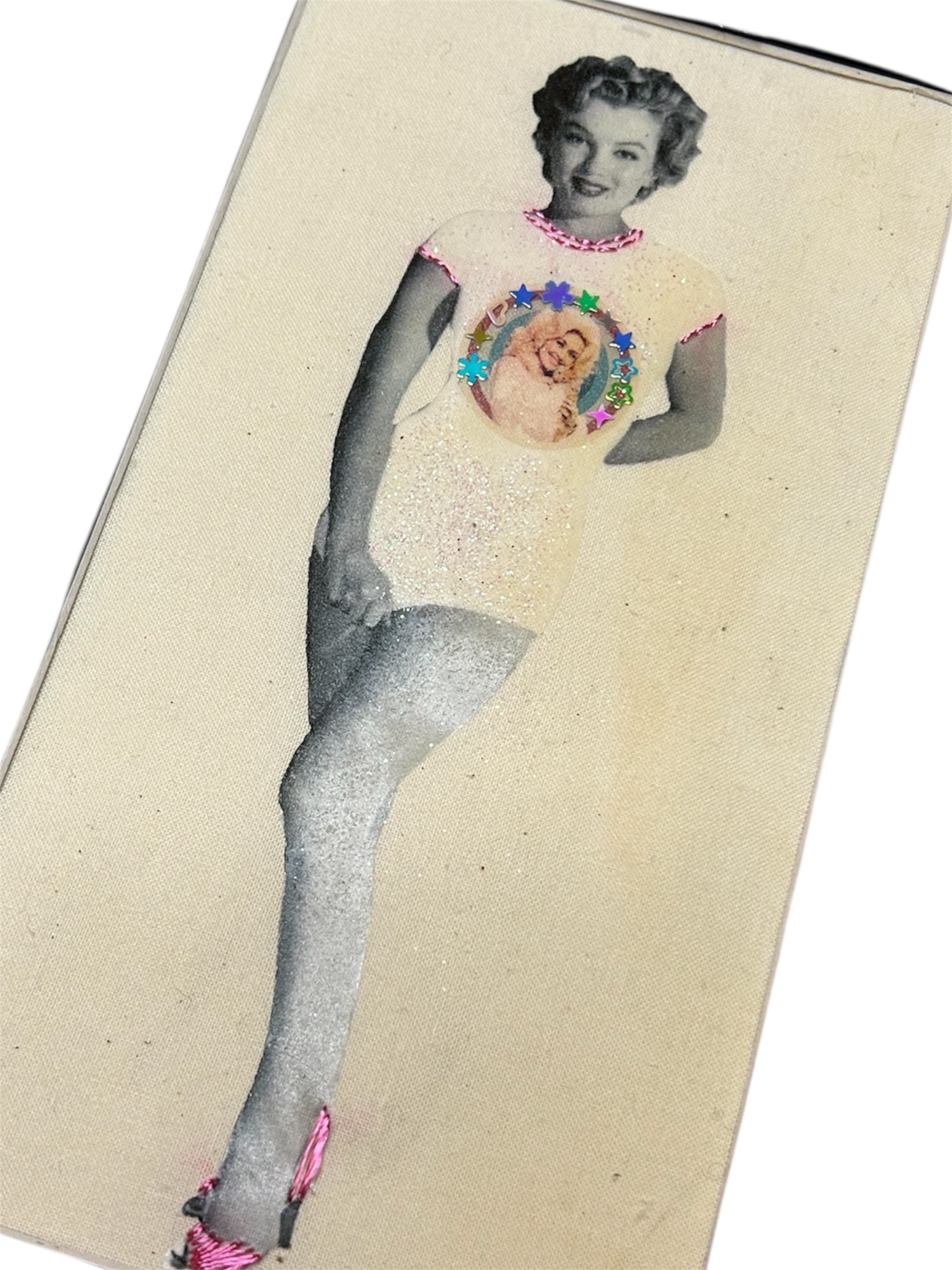 This original mixed-media embroidery artwork features Marilyn Monroe wearing a Dolly Parton t-shirt, combining vintage Hollywood imagery with modern feminist pop culture. Hand-embroidered and embellished with stitched and glitter details, this one-of-a-kind textile artwork explores fame, femininity, and self-authored identity.