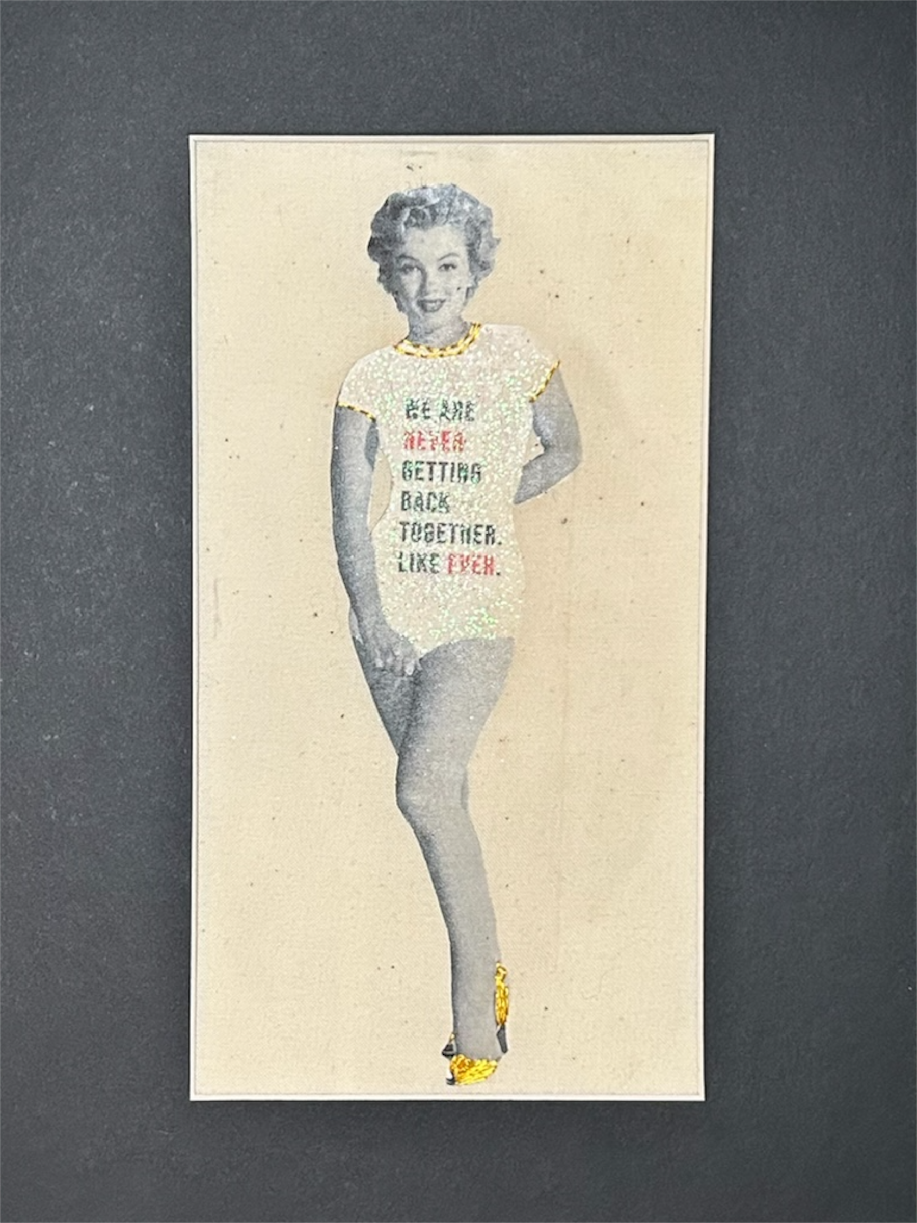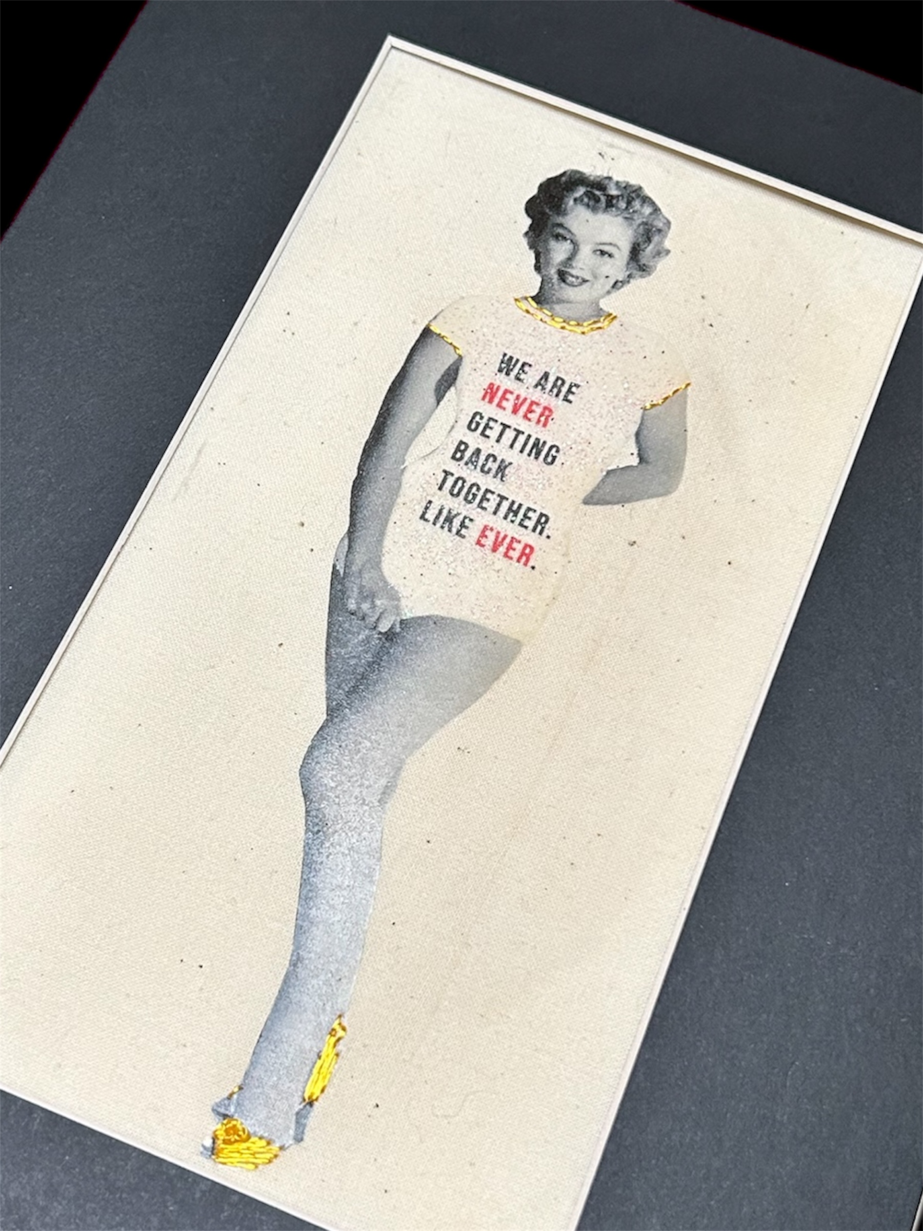 This original mixed-media embroidery artwork features Marilyn Monroe wearing a Taylor Swift t-shirt, blending vintage Hollywood imagery with contemporary pop culture symbolism. Hand-embroidered and embellished, this one-of-a-kind textile artwork explores celebrity, female authorship, and the evolution of women’s power in the public eye.