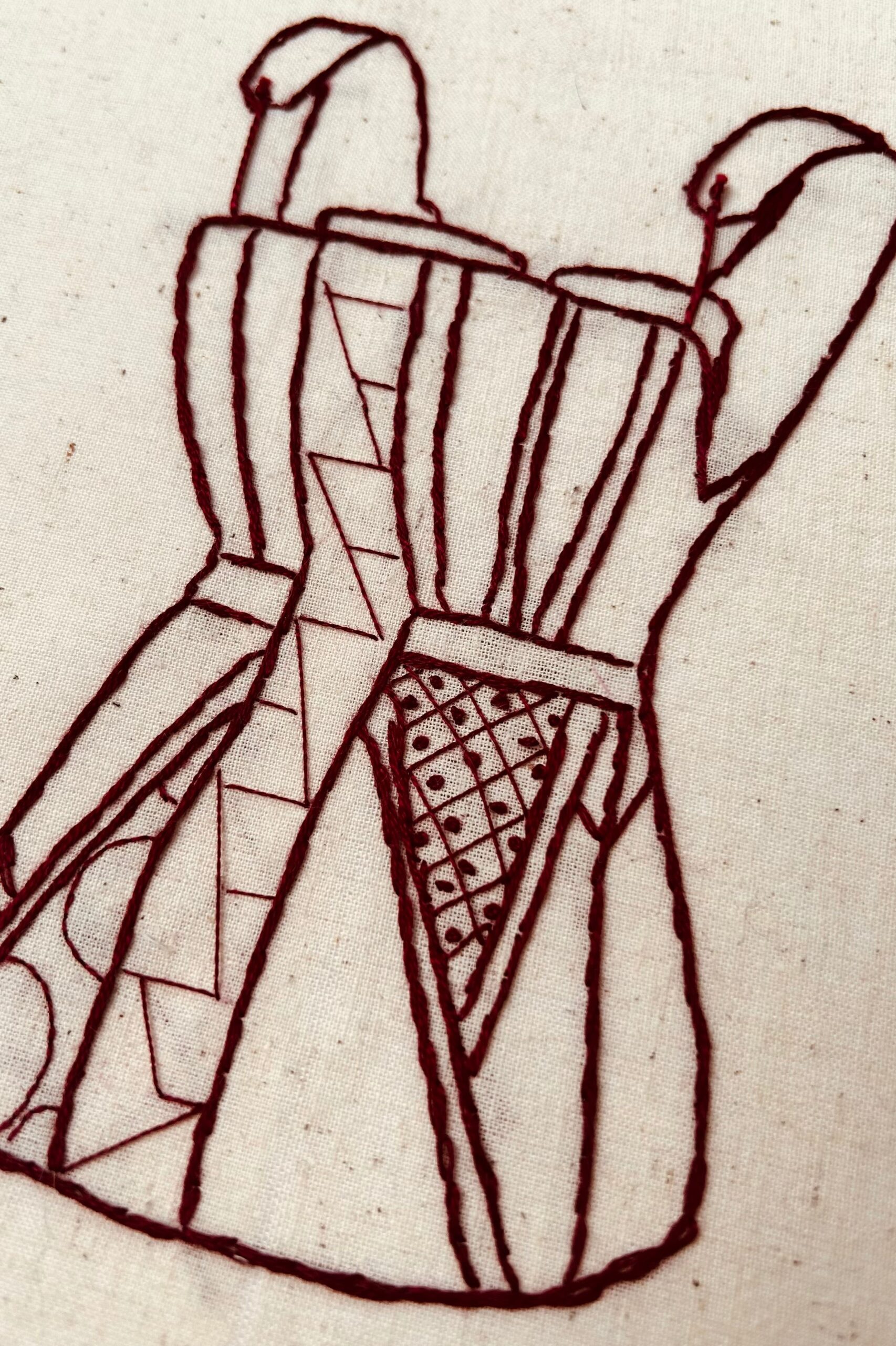 Inspired by late 19th-century corsetry, this piece invites a conversation between fashion history and feminist textile art. Clean lines and graphic stitch work bring a modern sensibility to a historical subject.