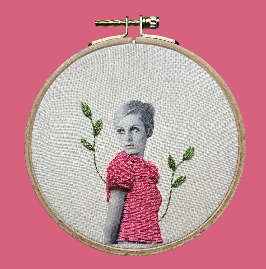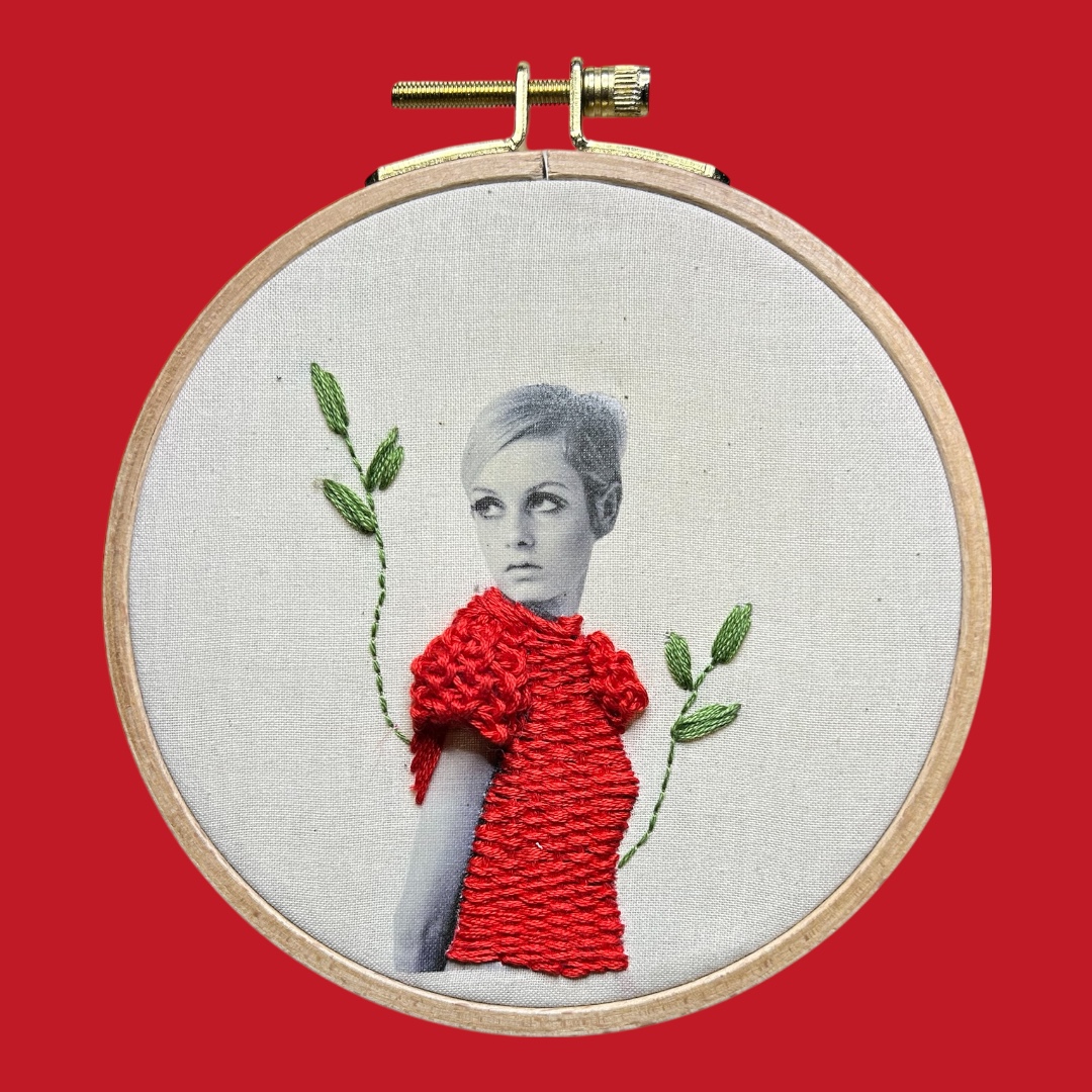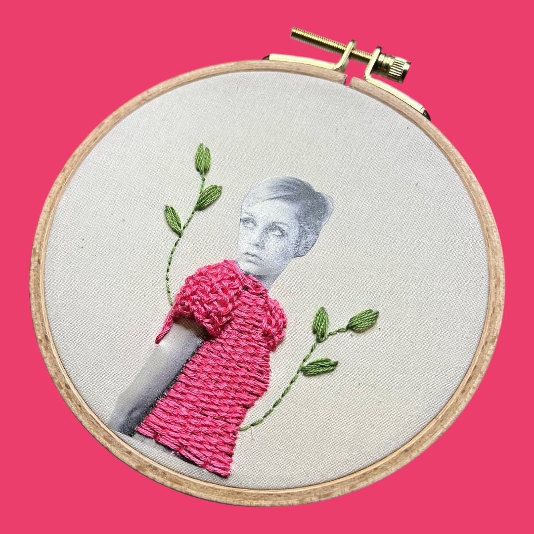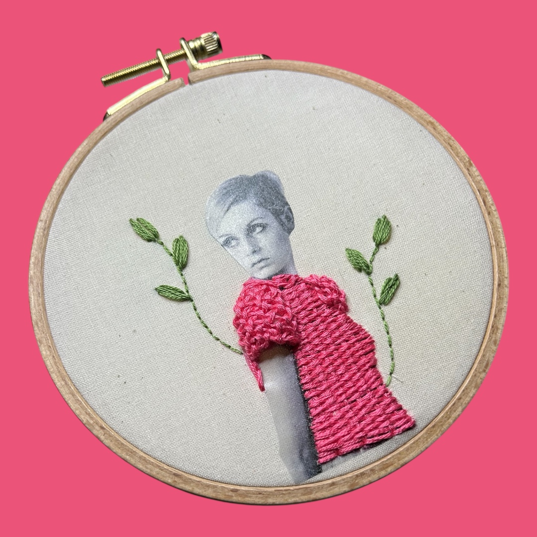 A vintage photo portrait brought to life with hand embroidery. This original textile artwork combines a transferred black-and-white image with bold stitched color and delicate botanical details. Each piece is made slowly by hand and designed to feel like a tiny, cinematic relic—part nostalgia, part modern statement.