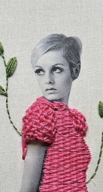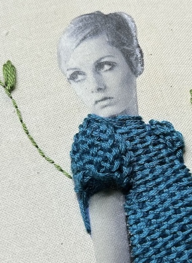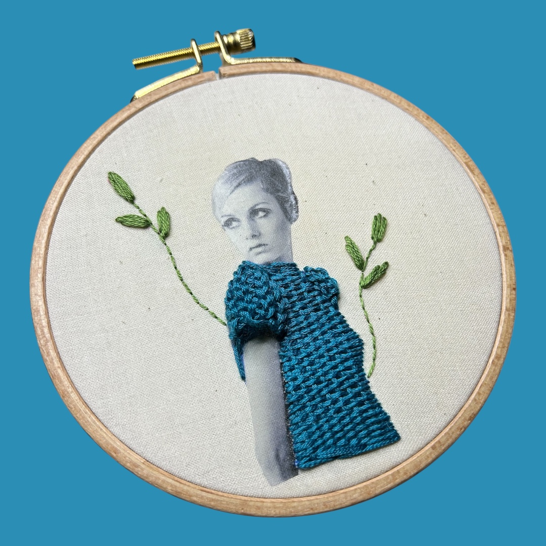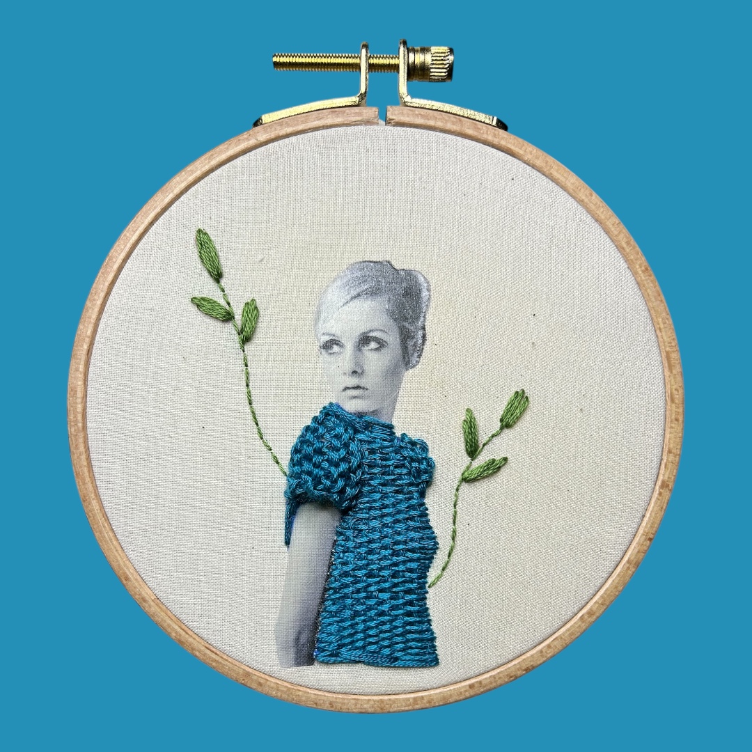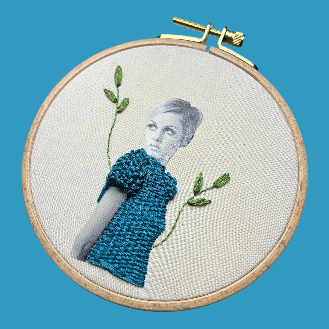 A vintage photo portrait brought to life with hand embroidery. This original textile artwork combines a transferred black-and-white image with bold stitched color and delicate botanical details. Each piece is made slowly by hand and designed to feel like a tiny, cinematic relic—part nostalgia, part modern statement.