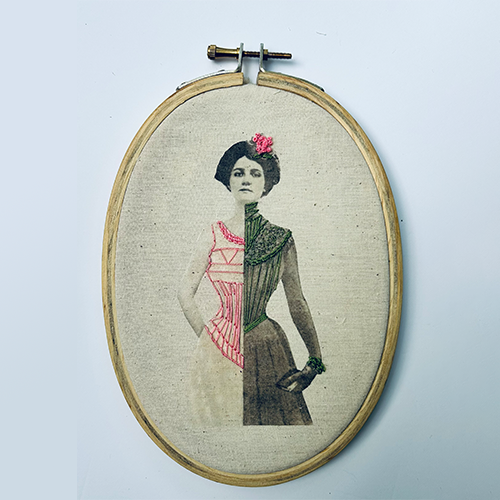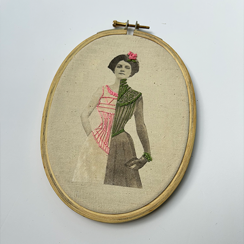 Divided Form is an original piece of hand-embroidered textile art, created from a vintage 1800s corset advertisement transferred onto cotton and framed in a 7.5″ x 5.5″ wooden embroidery hoop. With pink and green thread, the corset lines are stitched to draw out the tension between body and garment, structure and femininity. Floral embroidery accents on the head and hand introduce softness and resistance, adding a poetic, modern commentary on the control and beauty embedded in historical fashion.This piece merges fashion history, fiber art, and visual storytelling—inviting viewers to consider how women’s bodies have been shaped (and reshaped) by time, culture, and design.