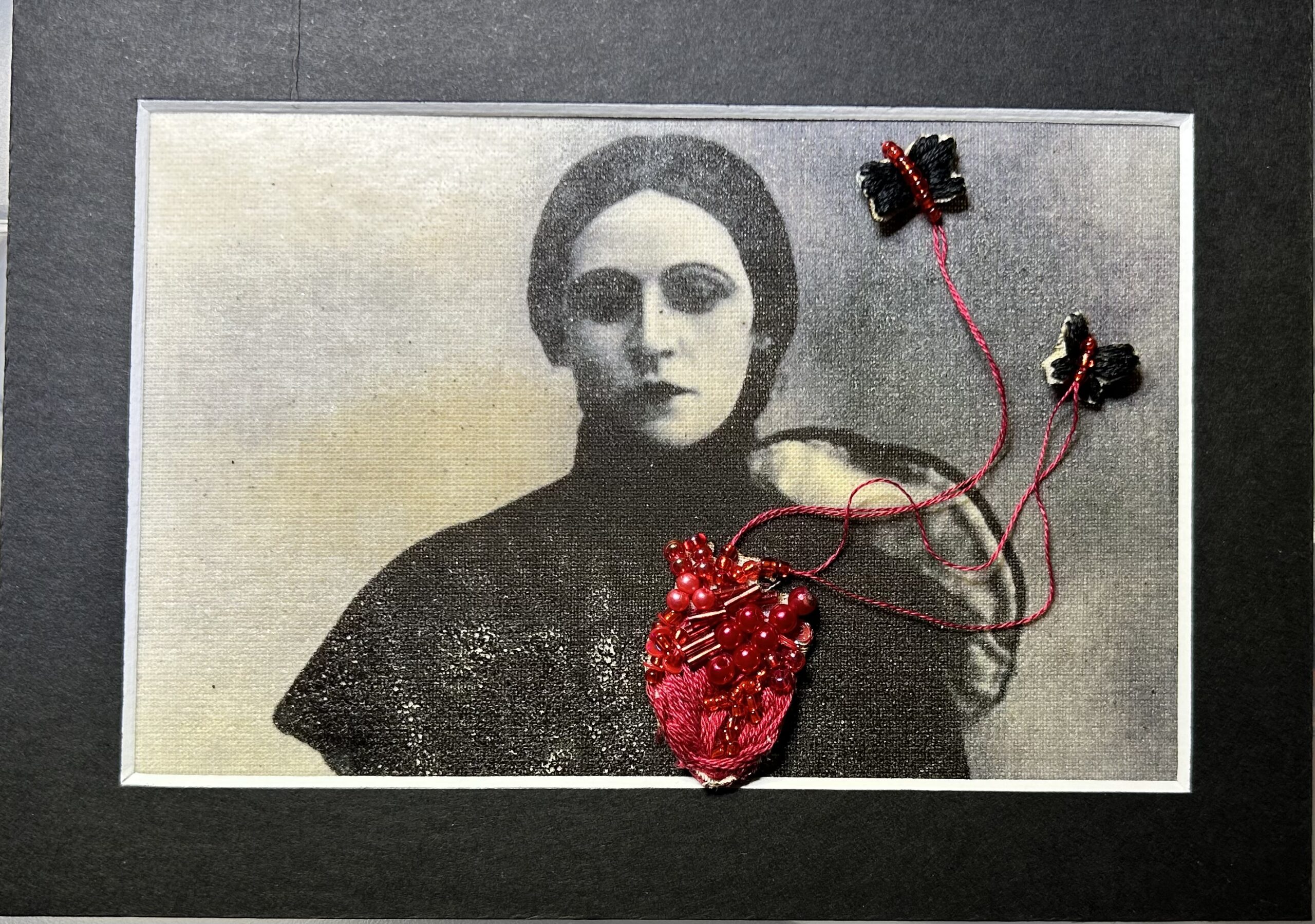 A vintage photographic portrait transformed with hand embroidery and beadwork. A sculptural red heart emerges from the figure’s chest, tethered by stitched thread that moves beyond the body—suggesting emotion, memory, and rupture.